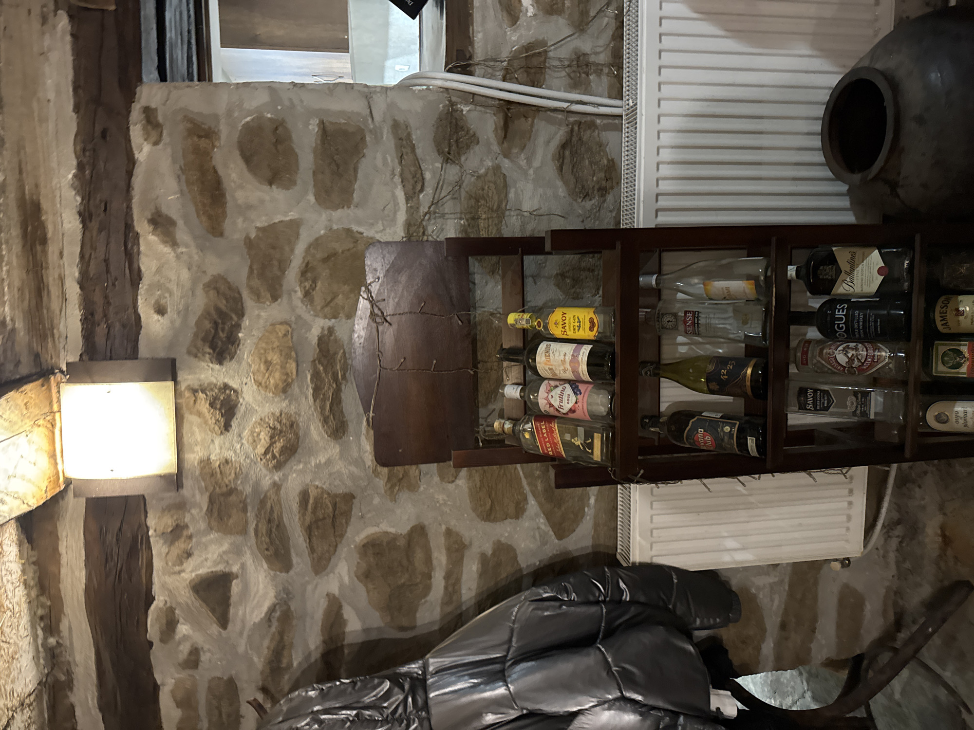The image depicts an interior setting in a building with a stone wall. A light fixture is mounted on the wall, illuminating the scene. A dark wooden shelf unit containing various bottles of liquor is positioned against the wall, interspersed with a white radiator. An aged clay pot sits on the shelf's top. A silver puffy jacket lays beneath the shelf. Some holiday lights are also strung on the shelf. The presence of Bulgarian products suggests a location in Bulgaria, possibly Gradevo, due to the bottles and setting typical of Bulgarian homes.
