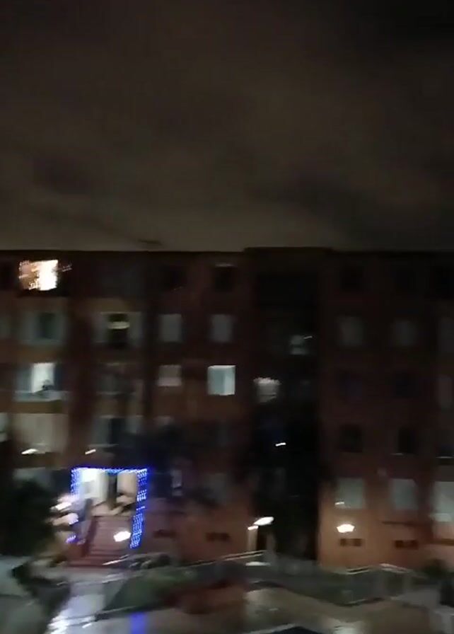 n outdoor scene at night in what appears to be a residential area. Several apartment buildings are visible, constructed of brown brick, with lit windows. The buildings surround a common area which features a playground with colorful equipment, a swimming pool, and what looks like a courtyard. The lighting in the common area is provided by street lamps and decorative light strings on the buildings. The sky is dark with clouds, and what seems to be a small light, potentially a star or airplane, is visible high above. The camera angle is from an elevated position, potentially from a building overlooking the scene.