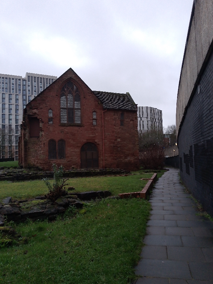 The image displays the Carmelite Friary of St. Mary (Whitefriars) in Coventry, United Kingdom, on an overcast day. The central subject is a two-story, red sandstone building, partially preserved. Its prominent upper-level window features a pointed arch with stone tracery and grid-patterned glazing, flanked by smaller rectangular windows. The lower level includes two arched window openings and a single arched doorway. The building's left side exhibits structural damage or missing wall sections. The roof is dark and tiled. In the foreground, a verdant grassy area reveals dark stone foundations and a sparse plant with green foliage. A low, reddish-brick border separates part of the grass from a paved pathway. This narrow pathway, composed of rectangular grey flagstones, extends into the distance on the right, appearing damp. It is bordered on its immediate right by a tall, dark grey brick wall, which transitions into a lighter, textured concrete wall above. The background features several modern high-rise buildings. A large, light-colored residential block with multiple windows is visible on the far left. Towards the center-right, a distinct contemporary building with a curved, vertically striped facade is present. Bare-branched trees are scattered in the mid-ground. The scene is unoccupied.