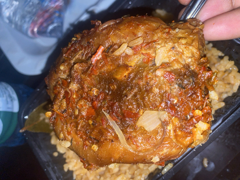A close-up shot presents a piece of cooked meat, possibly chicken, covered in a spicy red sauce with chopped onions. The meat is perched on a bed of yellowish rice within a black plastic container. A bay leaf peeks out from underneath. A hand holds the meat with a utensil, partly obscuring a container or bottle in the background. The dish appears to be take-out or prepared food.