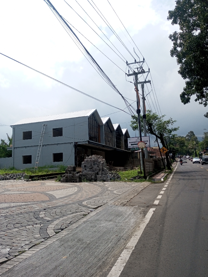 A two-story gray building with a silver roof and ladder stands beside a paved area with stacked bricks. Overhead power lines crisscross the sky, attached to a pole with signage. A road runs along the side, with vehicles visible in the distance. Trees frame the right side of the image. The sky is overcast.