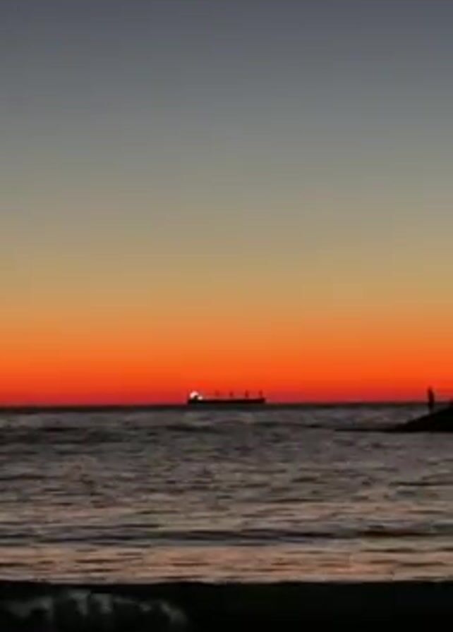 wide, static shot of a seascape at sunset. The sky transitions from dark blue-gray at the top to orange closer to the horizon. A large cargo ship is silhouetted against the bright orange sky. Calm waves wash onto the dark sand in the foreground. A figure is visible standing on a jetty on the right side of the frame. The overall impression is one of tranquility.