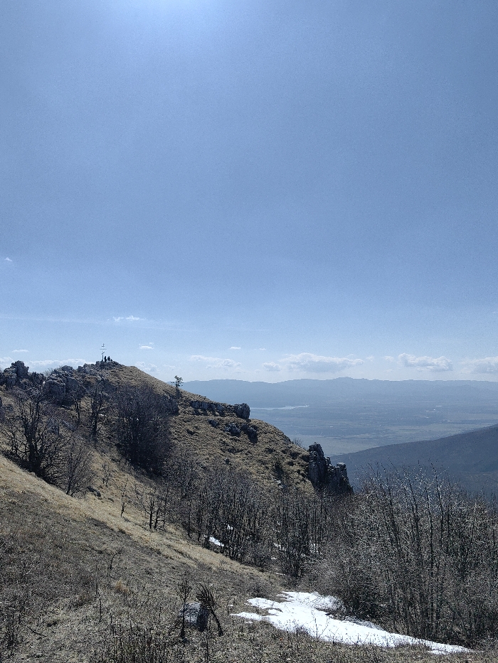 This image depicts a mountainous landscape, identified as the Balkan Mountains near Shipka, Bulgaria, under a clear, bright blue sky with a few wispy clouds along the distant horizon. The foreground features a steep, upward-sloping expanse of dry, yellowish-brown grass and sparse, bare deciduous trees, with a patch of melting snow visible in the lower right corner amidst thin, dry vegetation. The midground is dominated by a rocky ridge running from left to right, also covered in dry grass and scattered bare trees. Prominent grey rock formations protrude along the ridge line. On the summit of this ridge, at the far left of the visible crest, approximately four to five indistinct human figures are clustered around a dark, cross-like structure or small monument. They appear to be standing, observing the surroundings. In the background, a wide valley or plain extends into the distance, characterized by atmospheric haze, giving it a muted bluish-grey appearance. A long, narrow body of water, possibly a lake or river, is discernible within this valley on the right side. The far horizon is marked by successive layers of hazy blue mountains. The overall environment indicates late winter or early spring conditions during daylight hours.