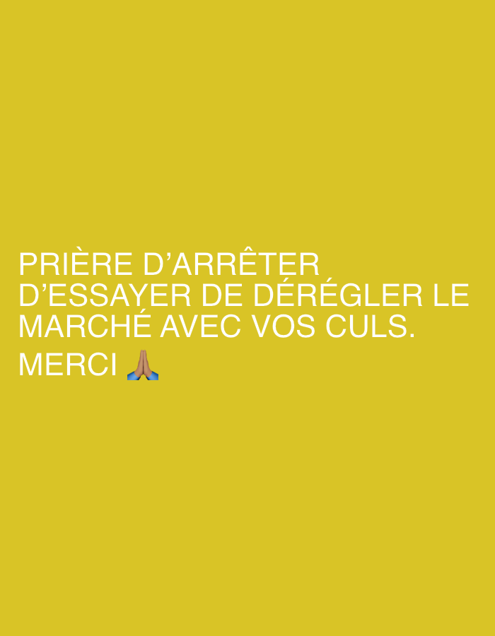 A yellow background displays the text "PRIÈRE D'ARRÊTER D'ESSAYER DE DÉRÉGLER LE MARCHÉ AVEC VOS CULS