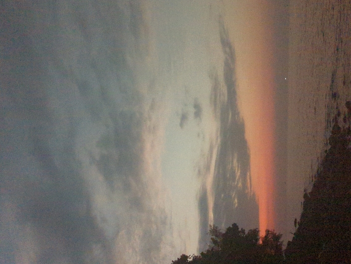 The image displays a coastal landscape at twilight, depicting a scene in a coastal area of Preah Sihanouk, Cambodia. The upper two-thirds of the frame are occupied by the sky, transitioning from dark grey-blue at the top to lighter grey and then to a band of orange and red hues along the horizon. Scattered grey clouds are visible across the sky. The lower right portion of the image shows a calm body of water, dark in tone but reflecting the ambient light. A distinct bright white point light source is visible on the water's surface towards the center-right, with fainter, smaller lights discernible further to the right. The lower left quadrant presents a dark landmass or rocky shoreline, characterized by irregular dark shapes at the water's edge. Dark, dense foliage, consistent with trees or bushes, is silhouetted against the sky along the upper edge of this landmass. No individuals or specific human activities are observable in the scene.