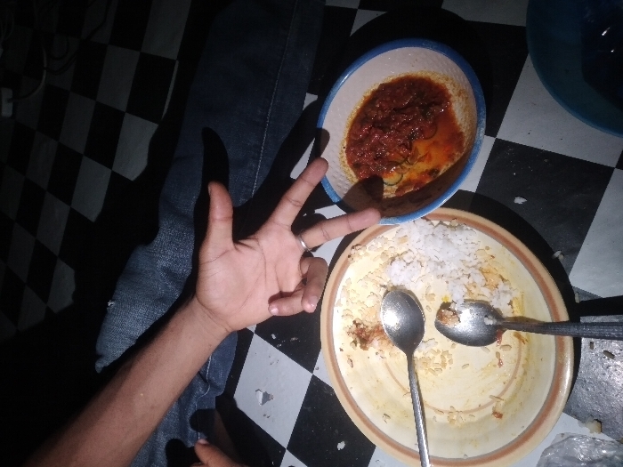 A person, wearing jeans, is seated at a checkered surface, presumably a table. Two bowls are visible; one with white rice and two spoons, and another with a red sauce. The person's hand is raised, displaying a "peace" sign with the index and middle fingers extended. The plates seem partially consumed, suggesting a meal in progress. Another object, possibly a plate, is visible to the upper right.