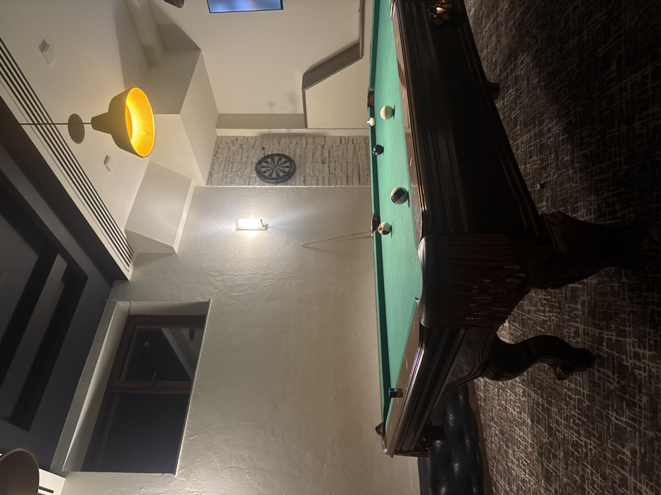 An indoor space features a billiard table with several balls on its green felt surface, positioned diagonally in the room