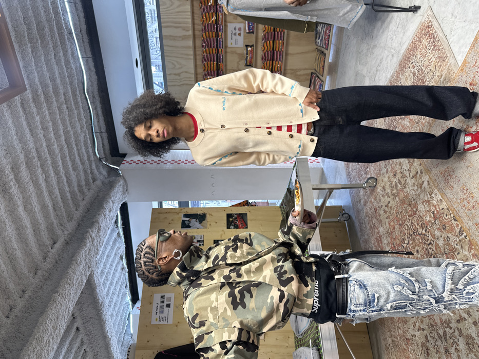 Two males are positioned indoors within a retail or event space in Paris, France. The male on the left, with dark cornrow braids, dark sunglasses, and large silver hoop earrings, wears a camouflage-patterned jacket over a black garment revealing a "Supreme" branded waistband, and light-wash distressed jeans. He holds a silver plate containing small food items and appears to be speaking to the second male. The male on the right, with dark, curly hair, wears a cream-colored button-up cardigan with light blue stitching details over a red and white striped shirt, dark blue baggy jeans, and red and white sneakers. He stands with hands in his pockets, facing the first male. The environment includes a textured light-colored ceiling, a patterned rug on the floor, and various display units in the background. A white wall with red checkered squares is visible behind the left figure, and a window to the exterior showing blurry buildings is on the right.