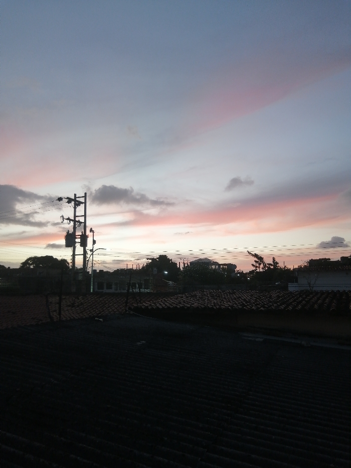 A dusky, vibrant sky dominates the scene with pastel pink and blue hues mingling above silhouetted buildings. A weathered rooftop fills the foreground, transitioning from a dull, dark color below to lighter brown tones in the middle ground. A utility pole stands to the left, while distant trees and buildings dot the horizon. The overall atmosphere evokes a sense of tranquility.