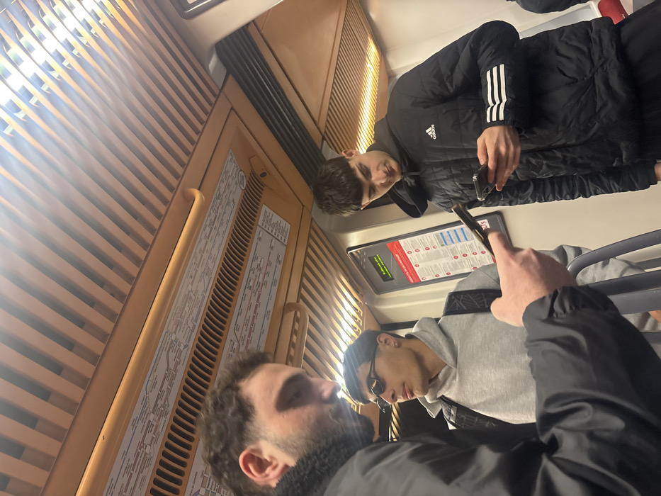 Three people are in a train car with light wood paneling. One person wears a black jacket with white stripes and holds a phone. A second person has sunglasses and a grey hooded sweatshirt. The third person's jacket covers most of the frame with a hand pointing a phone. A train map can be seen on the wall in the background.
