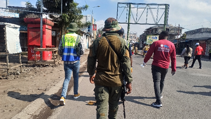 The image displays an urban street scene in Rubavu, Rwanda, under bright daylight. Three individuals are prominently featured in the foreground, walking away from the viewer on a street composed of both paved asphalt and unpaved dirt sections. On the left, an individual wears a green boonie hat, a plaid shirt, blue jeans, and a yellow and blue reflective vest with white text on the back. To their right, a central figure, appearing to be military or security personnel, wears a camouflage boonie hat, an olive-green long-sleeved tactical shirt, and matching cargo pants. This individual carries a dark-colored rifle slung across their back, with the stock visible below their right hip. Between the central and left figures, a small broom lies on the dirt path. On the right, a third individual wears a red long-sleeved shirt with "VILLE DE GOMA" and white text/graphics on the back, black trousers, and white gloves on both hands. In the mid-ground and background, several other people are visible, some wearing yellow attire, suggesting a coordinated group activity. The street is bordered by simple wooden stalls and structures on the left, including a prominent red box-like structure, possibly a large mailbox, with "Airtel" branding visible. Behind these, a building bears a sign with "PUBLIC INTER AFRICA" text. An overhead green metal gantry or framework spans across the street. Buildings of varying sizes and conditions line both sides of the street, typical of an urban environment, with a sign displaying "CLAIRE" visible on a building on the right side further down the road. The sky is clear, and shadows indicate a high sun position.