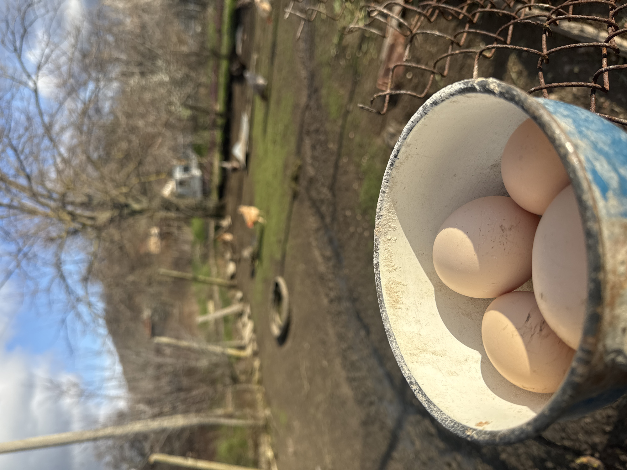 The image presents a close-up, foreground view of five light brown chicken eggs contained within a worn blue and white enameled metal bowl, illuminated by direct sunlight which casts distinct shadows. To the immediate right of the bowl, a rusty wire fence is partially visible. The background, largely out of focus, depicts a semi-rural domestic farmyard in Bardarevo, Bulgaria. This yard comprises areas of bare earth interspersed with sparse green grass. Multiple domestic fowl, including at least one reddish-brown chicken, are observable foraging or moving within the yard. Additional elements in the background include scattered wooden posts and a discarded tire lying on the ground. Beyond the yard, a hill or mountain range is present, covered with numerous leafless deciduous trees. Distant, indistinct residential structures are visible among the trees beneath a partly cloudy sky with patches of blue. The overall lighting suggests either early morning or late afternoon conditions.