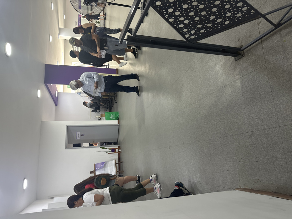 The scene depicts an interior view of a public or administrative facility located in Quilmes Oeste, Argentina. The floor is composed of gray square tiles with visible grout lines. Walls are primarily white, with sections of purple accenting a structural column and an upper wall in the background. The white ceiling contains multiple recessed circular light fixtures providing artificial illumination. On the far left, the lower legs and feet of an individual are partially visible, positioned against a white wall. Adjacent, a female wearing a white t-shirt, dark green leggings, and white and pink sneakers stands facing left. Behind her, another female in a red t-shirt, dark shorts, and a brown backpack also faces left. In the mid-ground, an older male with gray hair, dressed in a light blue button-up shirt, dark trousers, and dark sneakers, stands facing right, examining a small white document or card held in his hands. Further right, a male in a black t-shirt and dark pants walks towards the right. Beside him, another male, wearing a dark t-shirt, camouflage cap, gray shorts, and a dark cross-body bag, stands holding a small white object. Behind this individual, a female with dark hair, dressed in a dark top and light-colored pants, is visible. Another male is seen further in the background near a large industrial-style fan on the far right. To the left in the background, a gray door labeled "OFICINA" leads into an adjacent room where at least two individuals are seated at desks, engaged with computer monitors. A green shopping bag with a white logo is on the floor near this door. A wooden easel displaying a sign with a purple element and a potted plant on a stand are positioned in this area. A dark metal railing with a perforated, patterned design is prominent in the right foreground.