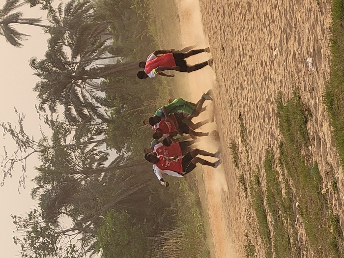 A group of young men play football on a sandy field. The players wear various colored jerseys, including red and white, and green. Dust kicks up as they run. Tall palm trees stand in the background, adding to the scene's tropical setting. Some grass borders the edge of the sandy field.