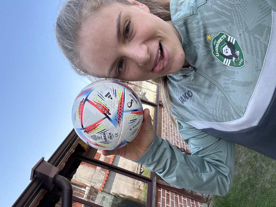 A young adult female is depicted in a close-up outdoor shot, holding a white Adidas "Al Rihla" soccer ball, associated with the FIFA World Cup Qatar 2022, in her left hand near her head