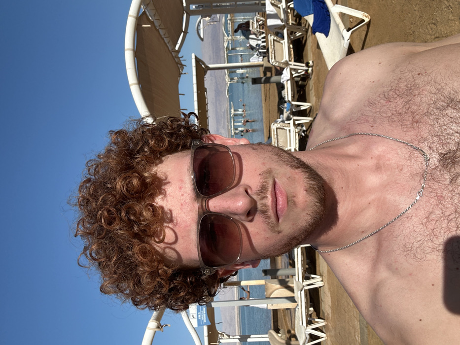 A fair-skinned male subject, estimated to be in his 20s, is depicted in a close-up, front-facing selfie-style image. He has reddish-brown curly hair, a light beard, and wears dark-tinted sunglasses with clear frames and a thin silver chain necklace. His upper torso is visible and shirtless, showing some chest hair. The subject maintains a neutral expression, and direct sunlight casts shadows on his forehead and nose. The background reveals a sunny beach scene located in the Tamar Regional Council, Israel, specifically along the Dead Sea. The calm, blue-green water of the sea is visible behind the subject, extending to distant, light-colored mountains under a clear blue sky. On the sandy shore, multiple white plastic sun loungers are arranged, some empty, others with towels, including a blue towel on a lounger to the far right. Several white, curved metal structures with fabric canopies provide shade over parts of the beach. In the mid-ground, multiple individuals are observed in the water, appearing to be floating or wading, while others are present on the beach near the shade structures and loungers.