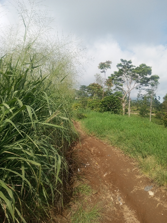 A dirt path cuts through a lush, grassy landscape under a cloudy sky. Tall green grass and reeds dominate the left side of the image, while a wider expanse of grass covers the right. Trees stand in the background, some mature with leafy canopies, and others smaller. The scene suggests a rural or agricultural setting, possibly a farm or plantation.