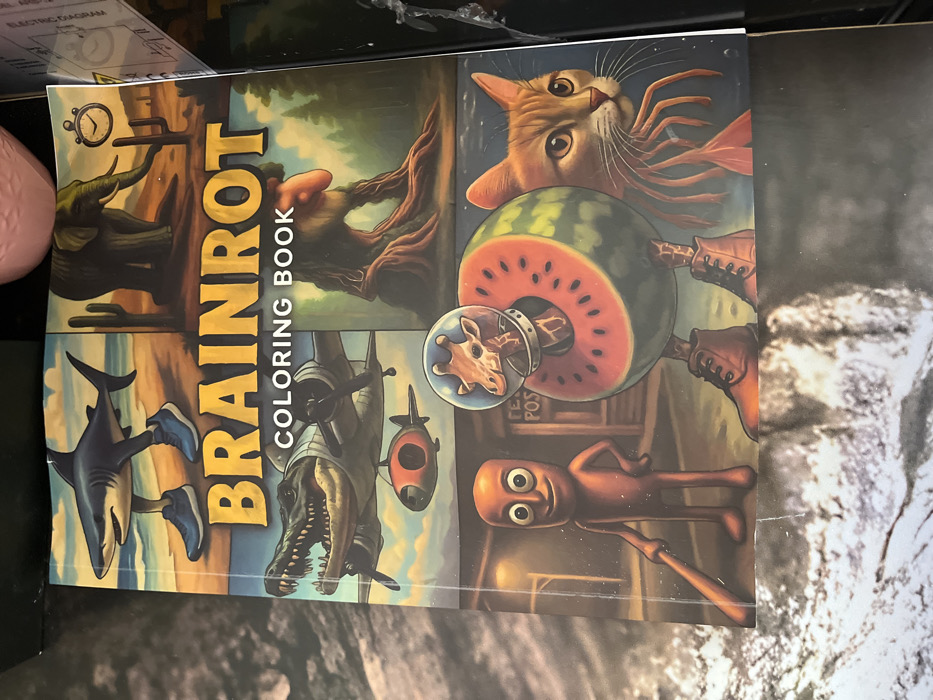 - "The image displays the front cover of a "BRAINROT COLORING BOOK," laid flat on a light-colored, textured surface" by FM-UfIZs2, licensed under CC BY 4.0