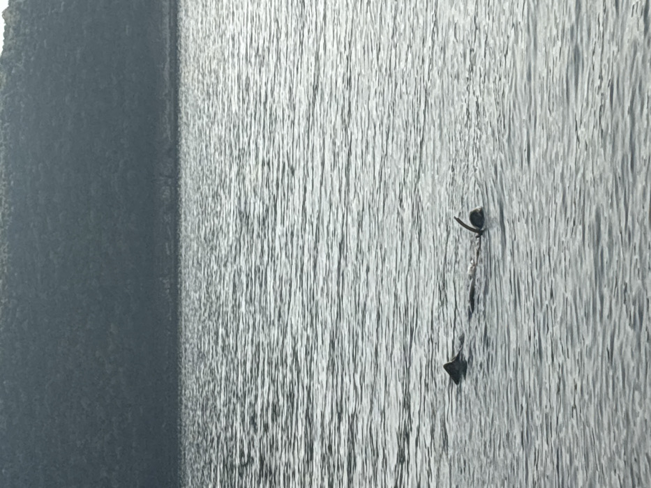 This image depicts a calm body of water, likely the sea, in the city of Kruče - Kërruçi, Montenegro. A distant, dark-colored landmass covered in dense vegetation forms the background, separating the water from a slightly lighter horizon line. In the mid-ground, a person is partially submerged in the water, lying on their back. The individual is equipped with snorkeling gear, identifiable by a dark snorkel mask and an upright snorkel tube extending above the water surface. Adjacent to the person's left side, a dark, triangular object resembling a shark fin protrudes from the water. The water surface exhibits minor ripples under what appears to be diffused natural light.