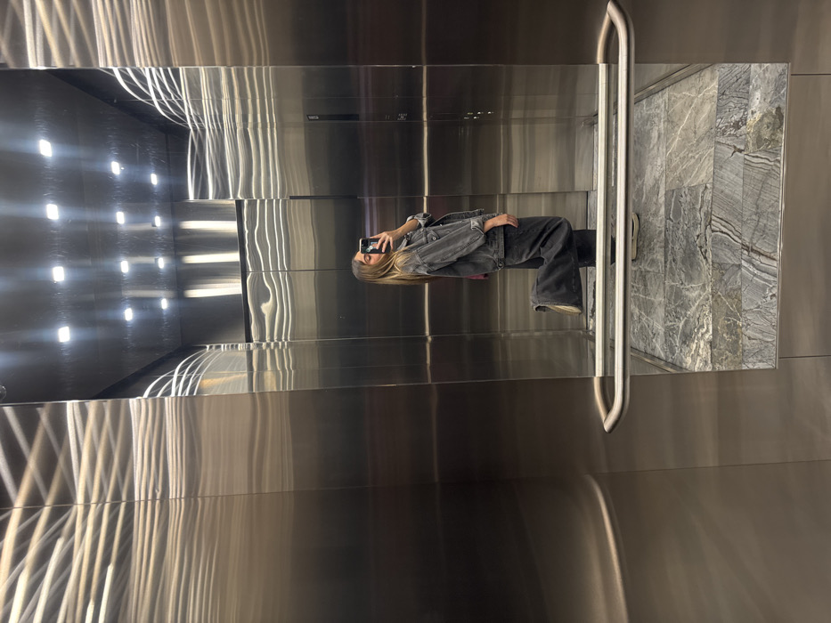 A person stands in an elevator, reflected in mirrored walls. The individual, dressed in a denim jacket and dark pants, holds a phone, possibly taking a picture. The elevator's interior features stainless steel walls, with vertical lines and reflective lighting. A grey marble panel is visible to the right, near the door. The overall impression is modern and sleek.