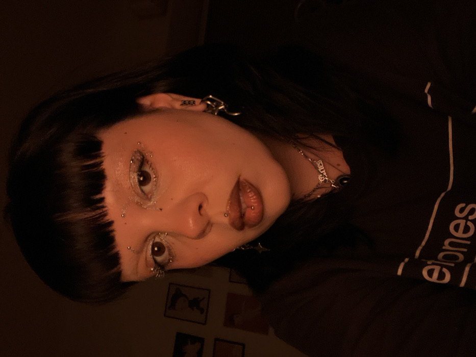 A person with dark hair and blunt bangs tilts their head towards the camera. Their face is adorned with subtle makeup and piercings around the eyes and lip. Silver earrings are visible, and a necklace with a charm rests on their chest. A dark t-shirt with light text is partially visible, suggesting a graphic design. Dim lighting creates a warm, intimate mood.