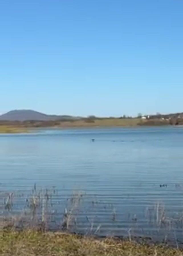 dog standing at the edge of a lake. The dog is black and brown, and it is looking out at the water. In the water, a black object can be seen moving. The lake is surrounded by grass and trees, and in the background, there are some hills. The sky is clear and blue.