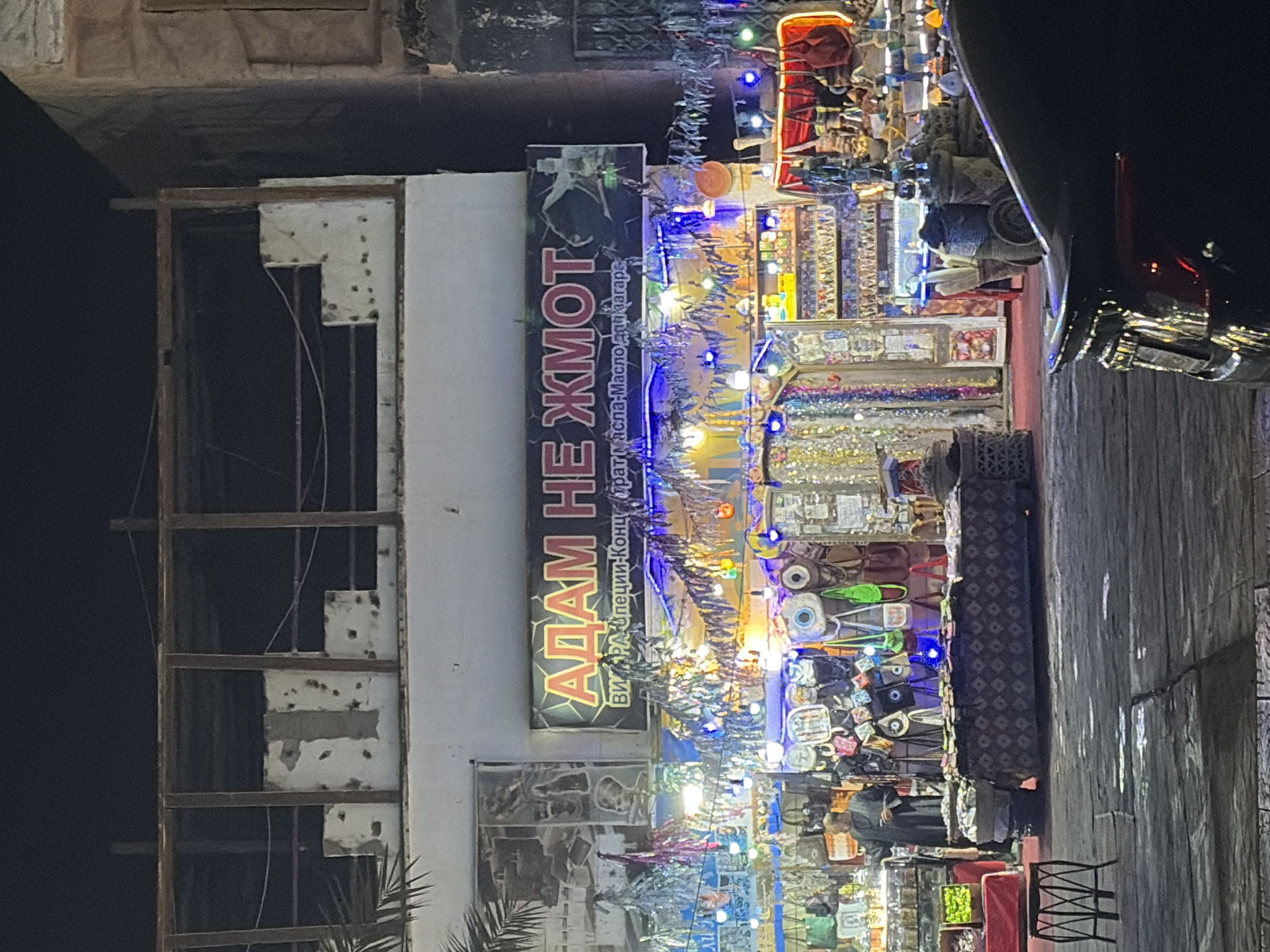 A nighttime image shows a shop in Sharm El Sheikh, Egypt. The shop is identified by a sign in Cyrillic, advertising "Adam HeMOT." The store is brightly lit with strings of lights and displays various merchandise, including handbags and other souvenirs, arranged on shelves and tables. A person in dark clothing is visible inside the shop. The sidewalk outside the shop is made of stone or concrete. A black vehicle is parked on the right side of the image. The image has a slightly blurred quality.
