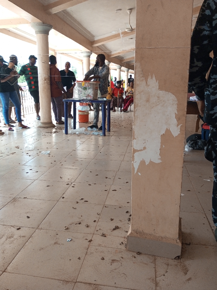 The scene unfolds in a public or communal covered space within the city of Ajalli, Nigeria, identifiable by its tiled floor, multiple light-colored support columns, and a visible ceiling fan. At the center, a bearded male, dressed in a denim-style shirt, stands behind a blue plastic table, actively handling a transparent plastic box labeled with white paper, consistent with a ballot or collection box. Two white buckets are stacked beneath the table. Approximately 10-15 other individuals are present. To the left, a group of five adults stands near a column, observing the central figure's activity. In the background to the right, several individuals, primarily women, are seated on red chairs. The tiled floor is extensively scattered with numerous small, dark, oblong objects and several discarded clear plastic water bottles. A large, light-brown rectangular pillar, exhibiting areas of peeling paint or removed adhered material, dominates the right foreground, partially obscuring a person in camouflage attire.