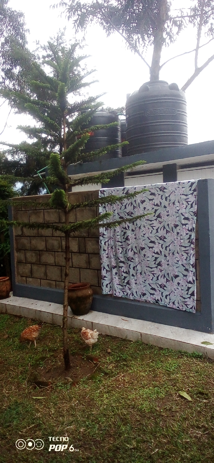 An outdoor scene in Mahiakalo ward, Kenya, depicts a residential area with a partial view of a building or compound. The foreground features a grassy lawn where two domestic chickens are foraging. One chicken, brown and speckled, is positioned left of a young conifer tree with tiered branches. Another chicken, lighter brown and white, is situated to the right of the tree. Two earth-toned ceramic pots are visible on the grass near a low, rectangular block wall. This wall, constructed from light-colored blocks with dark gray trim on its top and vertical pillars, supports a patterned fabric draped over it. The fabric displays a dark background with light green and purple floral or leaf motifs. Above the wall and behind the conifer tree, two dark gray cylindrical plastic water storage tanks, one bearing the label "SUMAS," are elevated on what appears to be a rooftop or platform. The sky is overcast and bright, and other trees are visible in the background.
