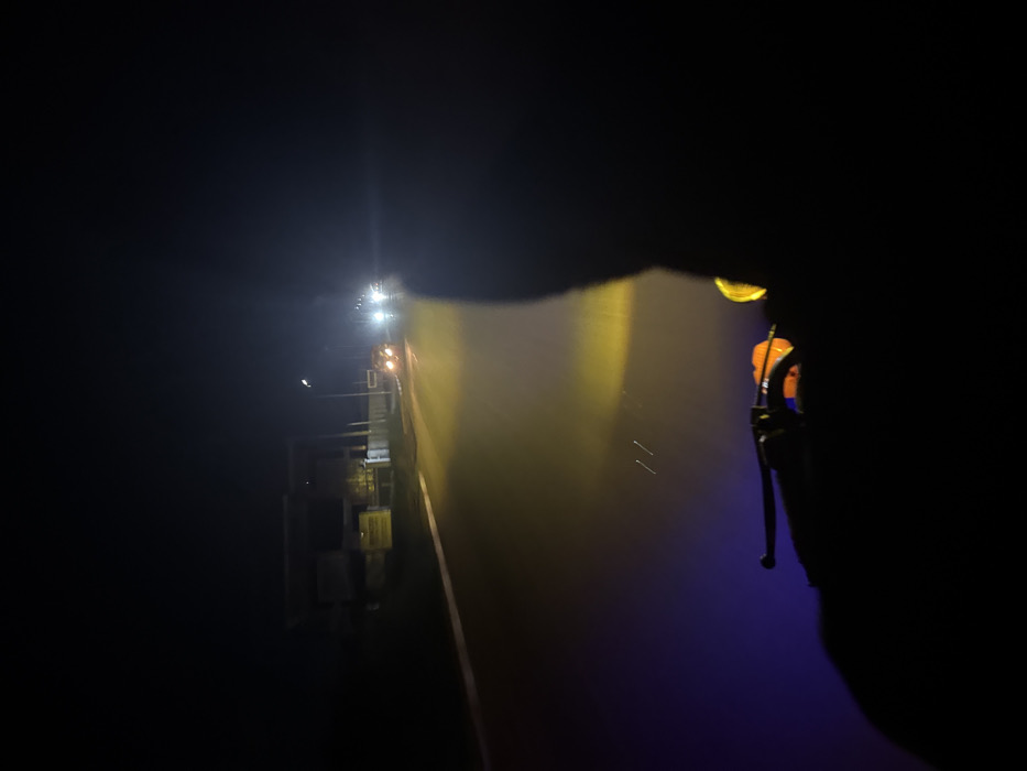 A night scene featuring a vehicle on a dark road, with headlights illuminating the misty environment. The vehicle, possibly a truck or construction equipment, is positioned on the left. A side view mirror is visible on the right, reflecting light. The scene is shrouded in darkness, with the lights cutting through the mist, creating an eerie and isolated atmosphere.