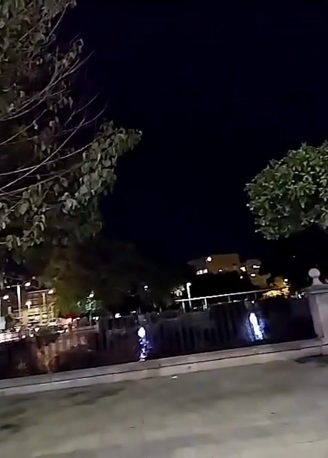 The camera is stationary, showing a night scene