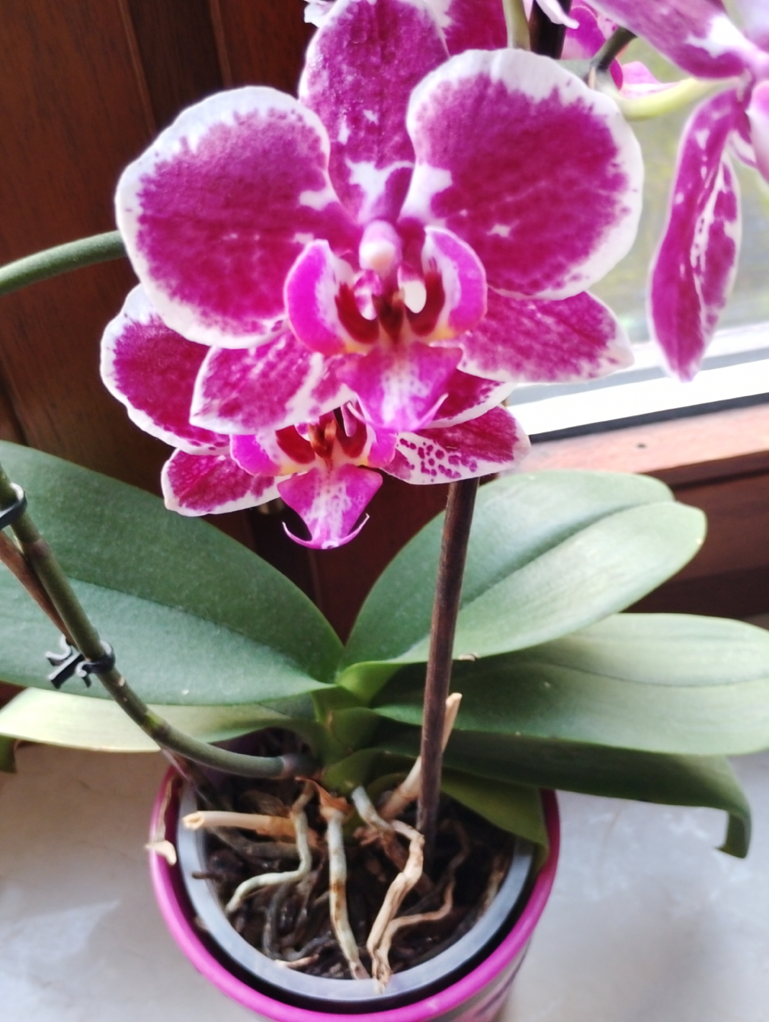 A close-up shot shows a potted orchid plant with vibrant magenta and white flowers. The orchid is potted in a pink and white striped container. The plant has several healthy-looking green leaves and exposed roots. The background is blurred. No people are visible. The location is not verifiable from this image alone.