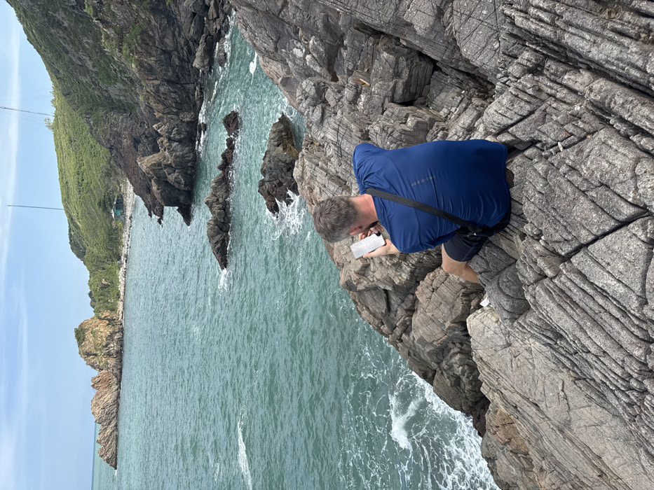 A person in a blue shirt kneels on a rocky cliff overlooking the sea. He appears to be taking a photo with a white object in his hands. The sea is a greenish-blue color and extends to the left, where land juts out into the water. More green-covered land can be seen further away, and rocky formations rise out of the water. The sky is light blue with some clouds. The photograph is taken from a high angle.