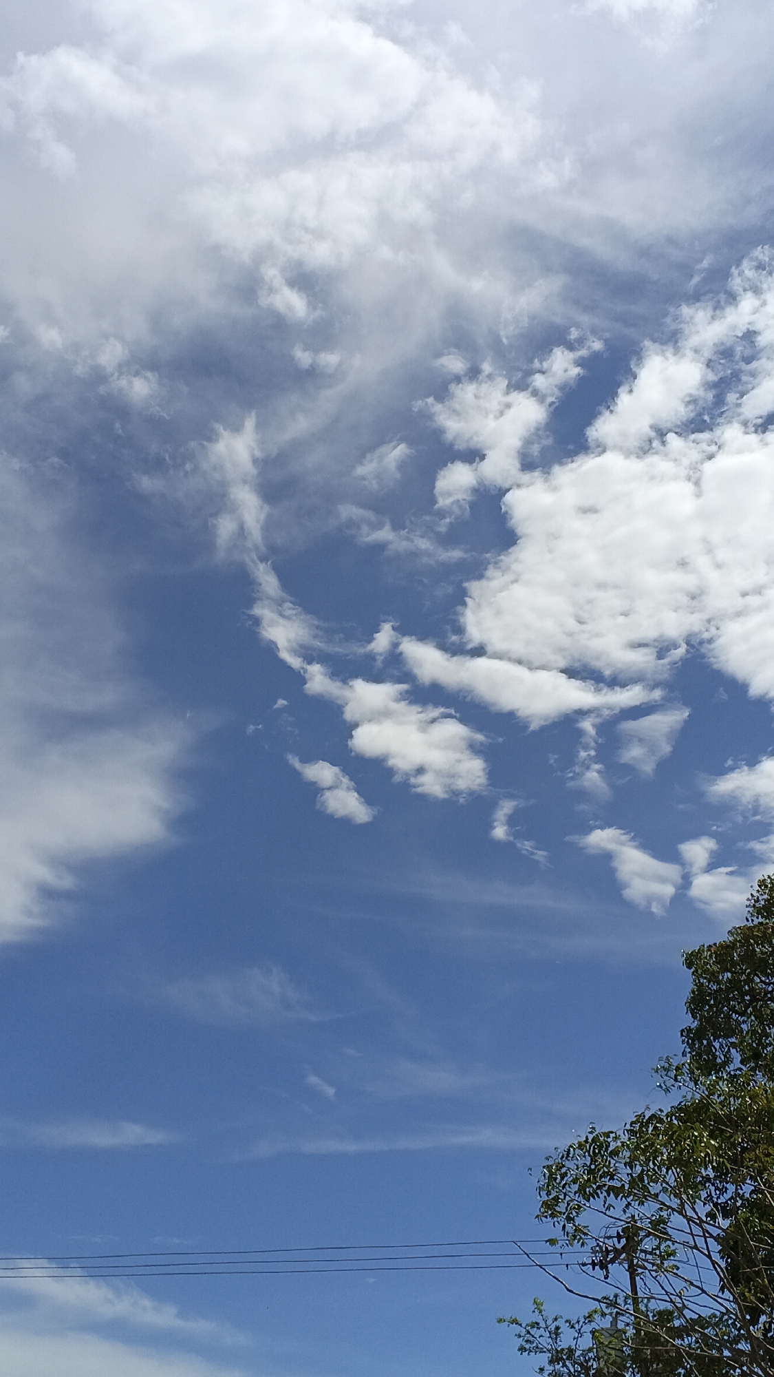 The image captures a daytime sky with scattered cumulus and cirrus clouds, indicative of fair weather. A portion of a tree with green foliage is visible in the lower right corner of the frame. Three electrical wires are horizontally placed in the lower portion. The photograph's perspective is from the ground, looking upwards. The sky transitions from a deep blue to a lighter hue with the varying cloud formations. The location appears to be Juan Griego, Venezuela due to similar images with geolocation data. No people or human actions are directly visible in the image. The environment is dominated by the sky and indications of greenery in the foreground.