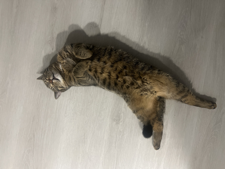 A domestic short-haired cat, displaying a brown and black tabby pattern, is observed lying supine on a light grey, wood-planked floor. Its head is tilted slightly backward, eyes are closed, and the mouth is slightly agape, revealing teeth. The front paws are curled inwards towards its chest. The left hind leg is bent with the paw visible, while the right hind leg is extended straight, with its paw obscured by the body. A segment of the tail, predominantly black, is visible near the left hind paw. A distinct shadow is cast to the right side of the cat, suggesting a light source from the left. The scene is situated indoors in Simferopol, Ukraine.