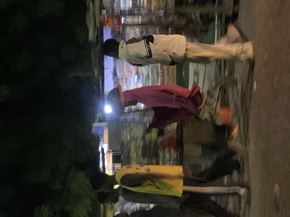 Three people walk along a sidewalk near buildings. The first person wears a white jacket and tan pants. The second wears a red shirt, while the third has on a yellow tank top. Streetlights and building lights illuminate the scene, creating a somewhat blurred image. The sidewalk appears dark, and trees can be seen on the left side of the picture.