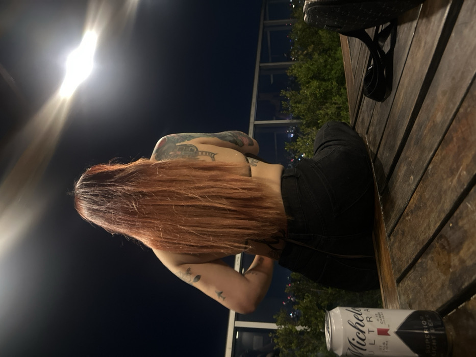 A woman with long, red hair and visible tattoos on her back and arm sits at a wooden table. She is wearing black jeans and has her back partially exposed. A can of Michelob Ultra beer sits on the table, near a purse. The background shows a dark night sky with some greenery and building lights in the distance. A bright light is positioned near the woman's head.