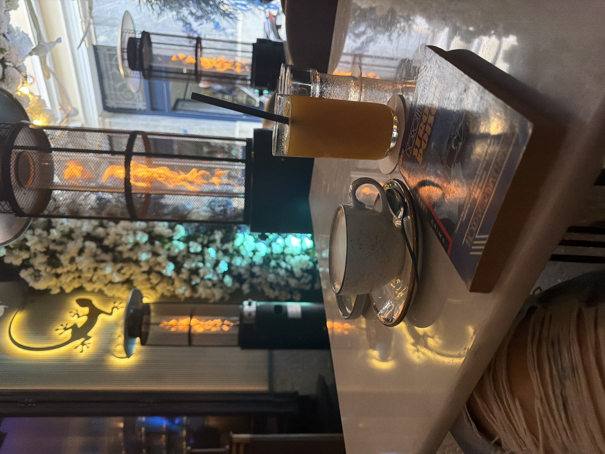 The image depicts a table setting at an outdoor cafe in Athens, Greece. A glass of orange juice with a straw sits next to a cup of coffee, and a book titled "Dorothy Stockbridge Tillet - Coroner's Crime" is placed on the table. Background includes an outdoor heater, white flowers, a neon lizard decoration, and the blue sky. A person is partially visible at the edge of the frame.