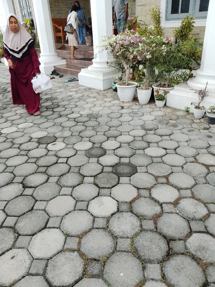 The scene is an outdoor paved area in Kertonatan, Indonesia, leading to the entrance of a building. The foreground is composed of a light grey interlocking paver pattern featuring octagonal blocks connected by smaller square blocks, with some moss and dirt visible in the crevices. In the left foreground, an adult female is walking towards the viewer's left. She wears a long-sleeved maroon dress/abaya and a light beige hijab with dark trim. She has light-colored sandals on her feet and carries a white plastic bag with red text ("KARTINI" partially visible) in her left hand. Her expression is neutral. In the midground, a light-colored building with large white classical-style columns and a raised entrance with steps is visible. Near the base of the steps, several pairs of sandals are discarded. On the steps, an individual wearing a light-colored dress and carrying a dark shoulder bag is either ascending or standing. Behind them, partially obscured by a column, another person in a light blue garment is visible. Further back, near the top of the stairs, another individual in a striped shirt is partially visible. To the right of the stairs, arranged along the building's base, are several potted plants. These include a prominent bougainvillea plant with white and pink flowers in a white pot, various green foliage plants in other pots, one with small red flowers, and one with dried branches. The building wall features a light-framed window. The lighting is overcast.