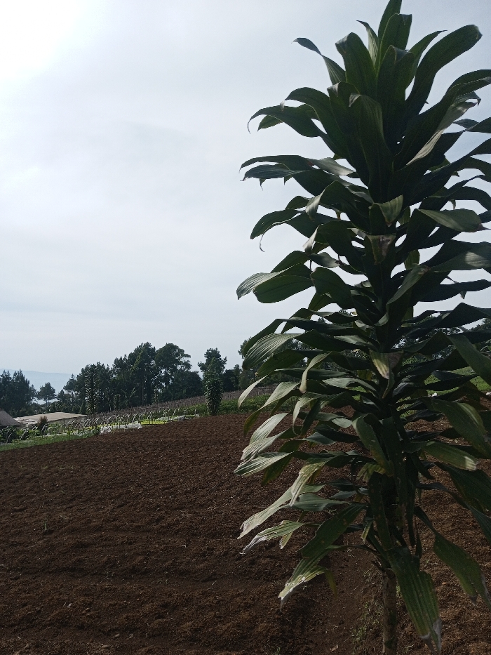 The image depicts an agricultural landscape under a light, hazy sky in Kandenuwara, Sri Lanka. In the foreground, on the right side, a tall, columnar plant with dark green, broad leaves growing spirally along a central stem dominates the frame. The leaves exhibit some minor discoloration or wear. The ground in the mid-ground consists of freshly tilled, dark brown soil, suggesting recent agricultural preparation. To the left of the tilled field, a section of lighter green vegetation is visible, possibly young crops planted in rows, with some white or light-colored support structures present. In the background, a dense line of dark green trees, primarily coniferous, forms a natural barrier, beyond which distant hills or mountains are faintly discernible through atmospheric haze. No individuals or active interactions are present in the scene.