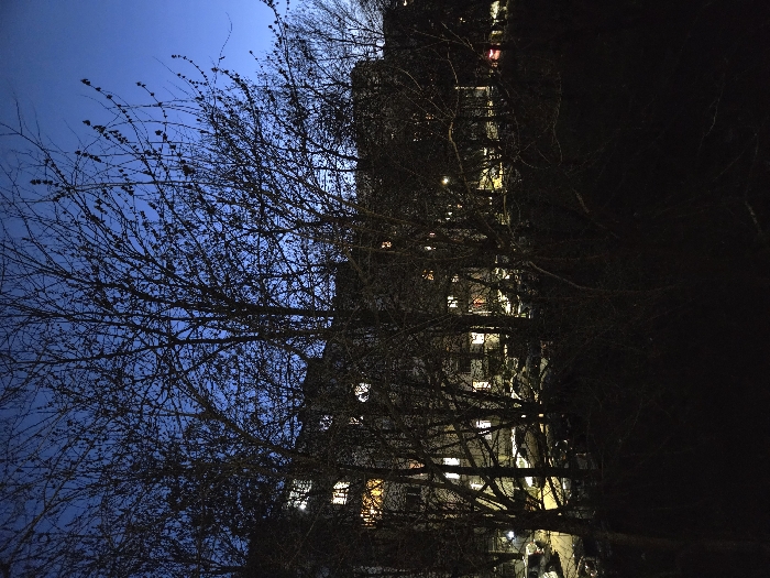 The image displays an urban residential scene in Pleven, Bulgaria, at dusk. Numerous bare deciduous trees with intricate branch patterns dominate the foreground and midground, silhouetted against a deep blue sky. In the background, several multi-story apartment buildings are visible, with multiple windows illuminated by internal lights, emitting warm yellow and white glows. Below these structures, a parking lot occupies the ground level, containing numerous parked vehicles. The ground shows patches of light-colored material, consistent with snow or ice, reflecting ambient light from the buildings and unseen streetlights. No human figures or discernible actions are present within the frame.