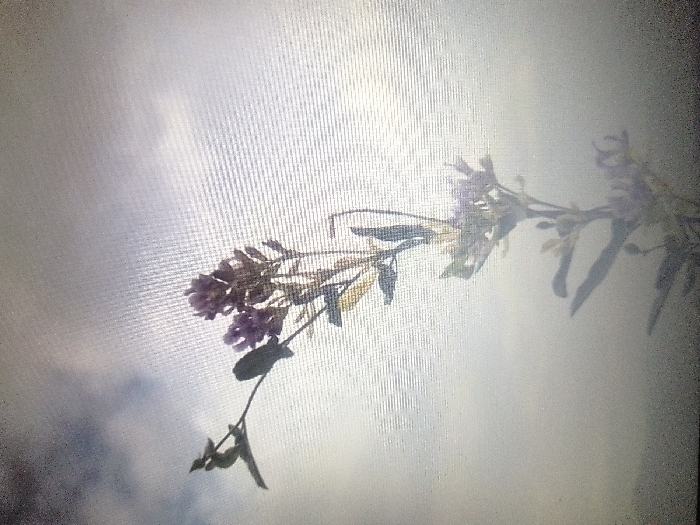The image depicts a flowering plant positioned centrally against a bright, overcast sky. The plant features slender stems, green leaves, and multiple dense clusters of small, purple flowers. The background is composed of a light grey and white sky, indicating heavy cloud cover. The lower foreground is dark and indistinct. No individuals or man-made structures are present. The image displays significant digital artifacts, including a prominent pixel grid and noise, consistent with a photograph of a display screen. This scene is located in Quetta, Pakistan.