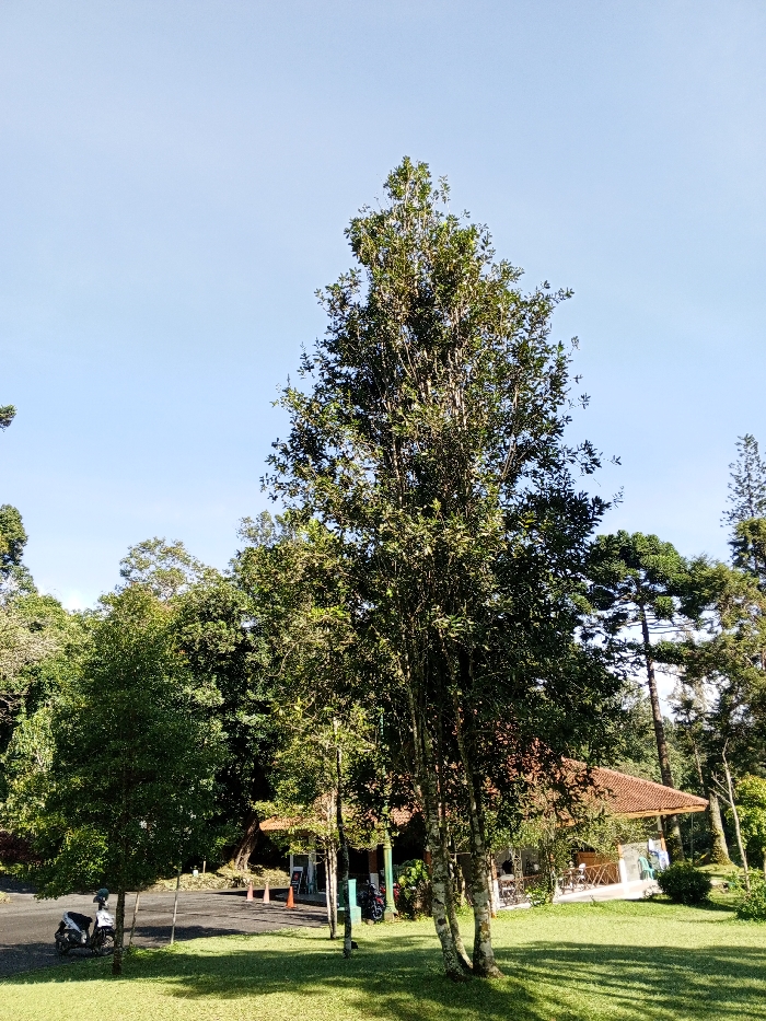 A sunny outdoor scene features a tall, slender tree with dense green foliage in the foreground. Behind the tree is a low building with a reddish-brown tiled roof. The ground is covered in lush green grass. A few motorcycles are parked near the building and beside a smaller tree to the left. Other trees of varying sizes surround the area. The sky above is clear and blue.