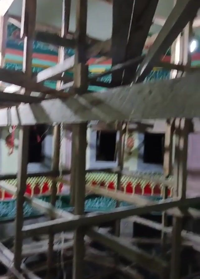 The camera pans across the interior of a building under construction or renovation. A scaffolding structure of wooden planks and beams fills much of the frame. The camera moves upwards to reveal finished portions of the building's walls, decorated with green, red, and gold ornamentation. Arabic script is incorporated into the wall designs. Windows are visible, but appear dark, suggesting an absence of natural light. The lighting is dim, making it difficult to discern further details.