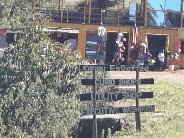 A wooden signpost with four white-painted wooden planks. The top plank reads "Karibu Esoofee," the second plank reads "Curio Shops," the third plank reads "Utility Shop," and the bottom plank reads "Executive Washroom." The sign is propped up on two wooden posts. The signpost is situated in front of a building with a wooden facade and an open doorway with various items hanging on the inside. There are several people standing in front of the building. There is a bush with green leaves in the foreground of the image. The scene is located at a latitude of -1.019 and a longitude of 36.623 in Escarpment, Kenya.