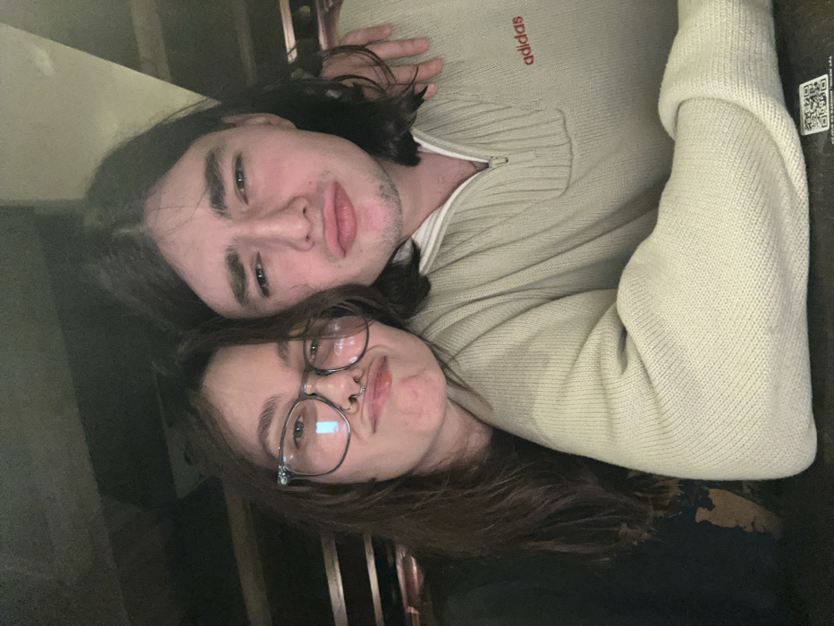 Two young people pose for a picture lying next to each other. The person on top has long dark hair and is wearing an off-white Adidas sweater with a quarter zip. The person below also has long dark hair and wears eyeglasses. Both are looking up at the camera with slightly pursed lips. The background is dark and out of focus. A QR code is visible in the upper right corner.