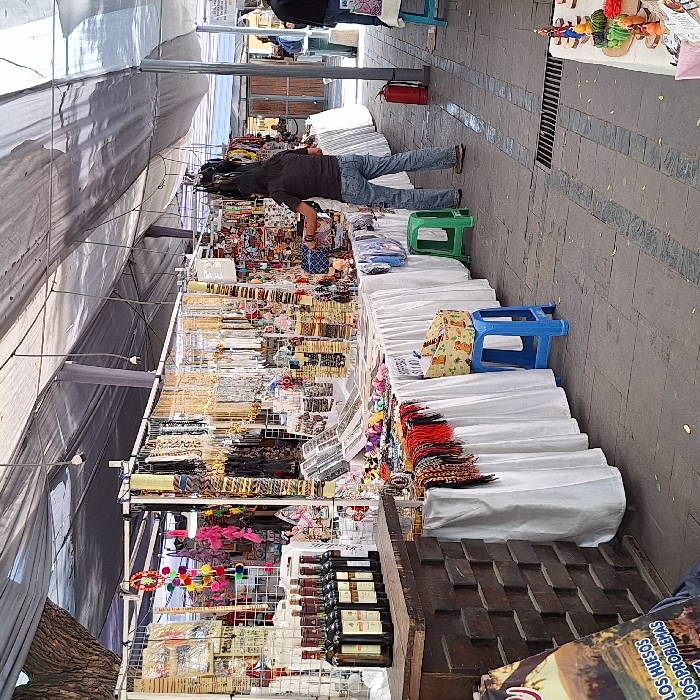 An outdoor market under a tent-like structure displays numerous stalls with diverse merchandise. Jewelry, trinkets, and bottles of wine are visible. A person in a dark shirt and jeans stands beside a table laden with goods, while other shoppers browse in the distance. The market's floor is paved with stone, and plastic stools are scattered among the stalls.