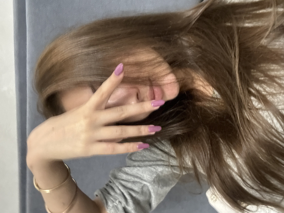 A person with long, light brown hair lies sideways with a hand partially covering their face. The person's nails are painted a light purple. The wrist sports multiple gold-colored bracelets. The person wears a gray, short-sleeved shirt, and the background appears to be a gray or muted blue surface, possibly a bed or couch. The overall lighting is soft and diffused.