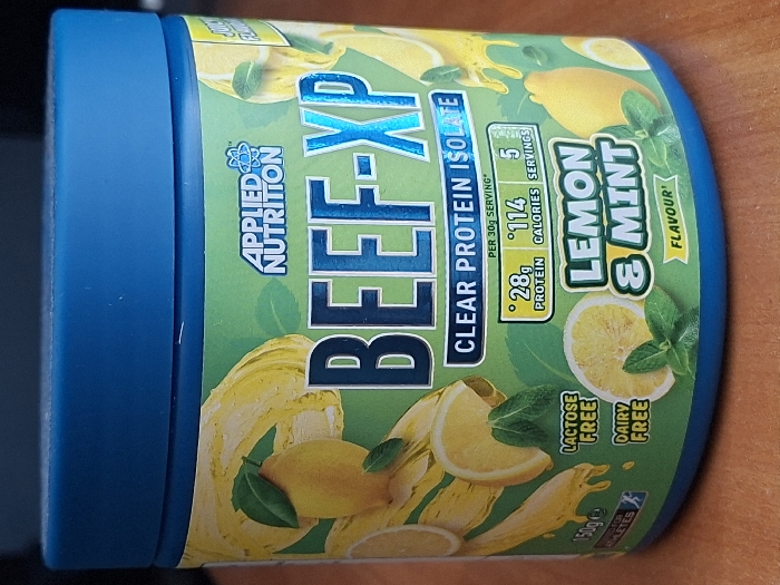 The scene depicts a single cylindrical product container with a blue screw-top lid, positioned upright on a light brown, wood-grain surface. The container's label is predominantly lime green, featuring illustrations of whole lemons, sliced lemons, and fresh mint leaves, with yellow liquid splashes and drips. The brand "APPLIED NUTRITION" is visible at the top center of the label, above the large, metallic blue text "BEEF-XP" which is further described as "CLEAR PROTEIN ISOLATE." Nutritional information indicates "28g PROTEIN," "114 CALORIES," and "5 SERVINGS" per 30g serving. The product's flavor is "LEMON & MINT." Additional text states "LACTOSE FREE," "DAIRY FREE," and "150g e." A small icon of a running figure accompanies "TESTED FOR ATHLETES." The environment suggests an indoor setting, possibly a table or countertop. There are no individuals, actions, or interactions depicted. The location is in the city of Selyanin, Bulgaria.