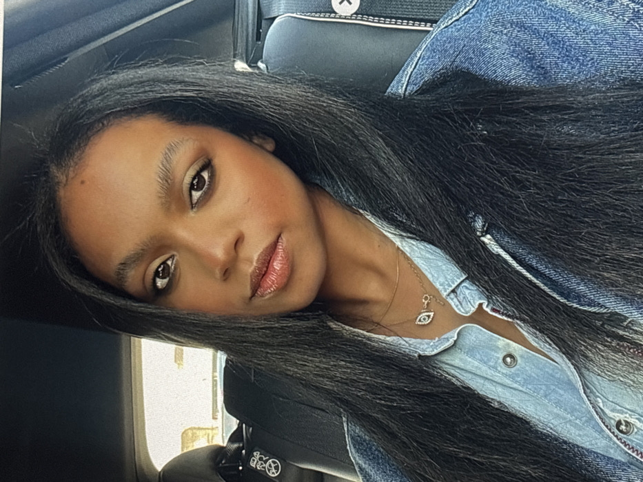 A woman with long black hair and brown eyes looks at the camera, her face angled. She wears a denim shirt, partially unbuttoned to reveal a delicate gold necklace with an eye-shaped pendant. The seat of a car is behind her, visible in the background. She has lipstick, blush, and eyeshadow on her face.